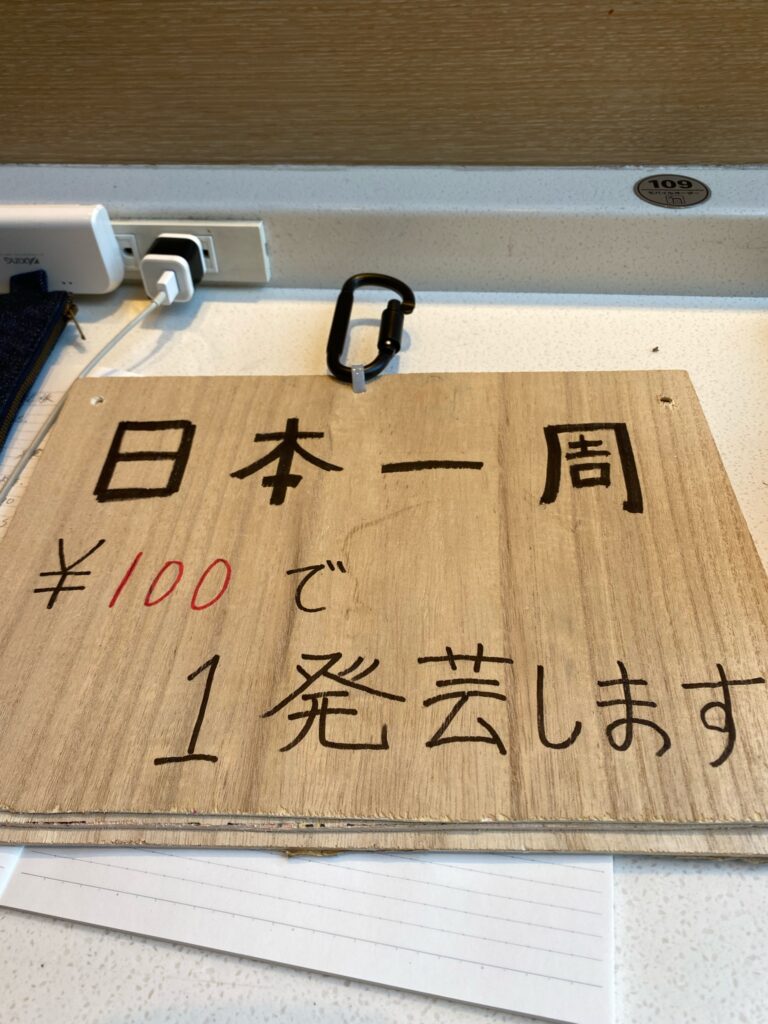感動して「なぜ、見ず知らずの僕をもてなしてくれるんですか?」と聞いたら「自分が旅してたときもこうやってもてなしてくれた人たちがいた、その時の恩をまた次の人に循環させる」と熱い話も聞けた。僕も胸いっぱいになって最後盛り上げようと、日本一周中の看板に掲げた1発芸を披露、ちょっと変な空気になって、焦って2発目、3発目と繰り出し、やればやるほど状況は悪化した、責任を感じたのか、お父さんだけ笑ってくれて心が痛かった。僕のせいで恩の循環がストップしてしまった。